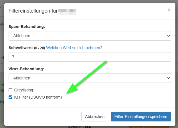Spambarrier KI-Filter March 24, 2026 by huestel Leave a Comment Die KI-Filter können nun im Filter-Bereich bei den Domain-Einstellungen explizit aktiviert oder deaktiviert werden. Diese Einstellung hat im Free-Tarif keine Auswirkung.